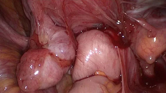 This laparoscopic image shows a frozen pelvis caused by extensive deep infiltrating endometriosis. Multiple pelvic organs—including the ovaries, rectum, and surrounding peritoneal tissue—are tightly adhered by dense, fibrotic adhesions, creating severe immobility and distorted anatomy. This presentation is typical of advanced-stage endometriosis where chronic inflammation leads to scarring, organ fixation, and loss of normal pelvic separation.